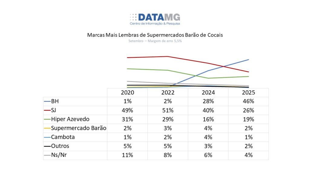 Barão de Cocais, tradicionalmente marcada pela mineração, agora vive uma disputa acirrada também no setor supermercadista. DataMG realizou pesquisa no último dia 27 de setembro, com margem de erro de 5,5% e intervalo de confiança de 95% sobre as Marcas Mais Lembradas – Topo of Mind de Supermercados. O estudo mostra que o BH Supermercados ganhou força em tempo recorde e alterou o equilíbrio de mercado na cidade.